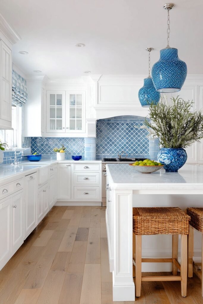 - Tile your backsplash with patterns featuring varying shades of blue.