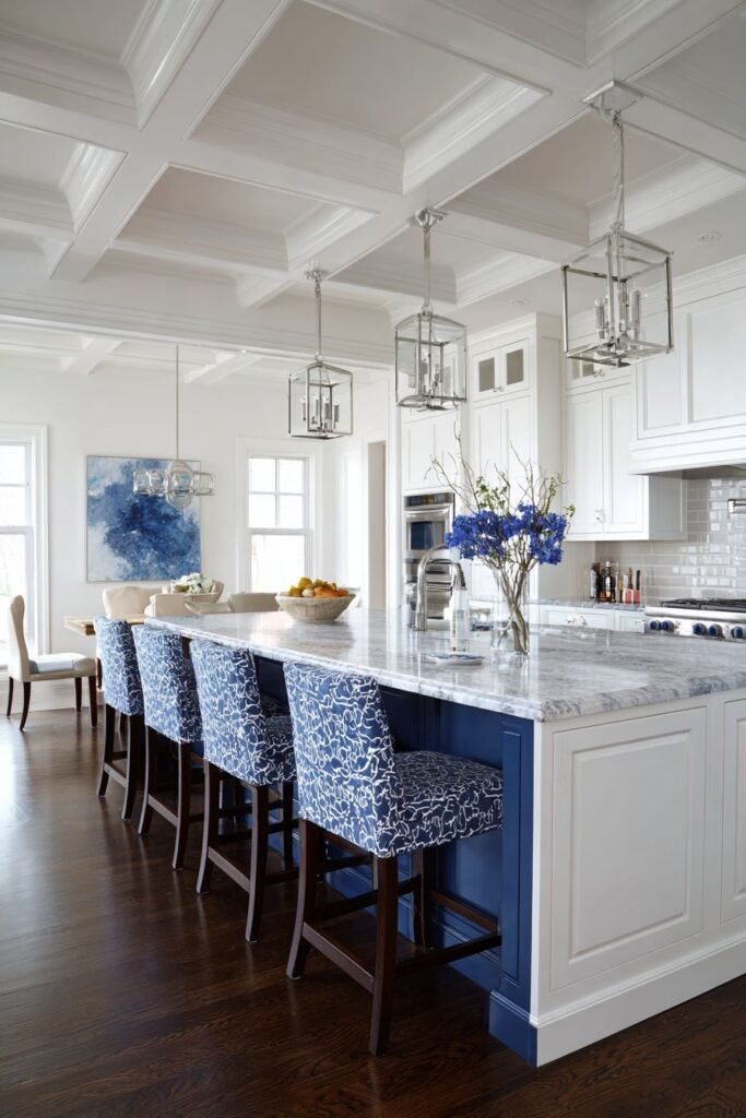 - Include ceramic dishes in cobalt, navy, or sky blue for open shelving.