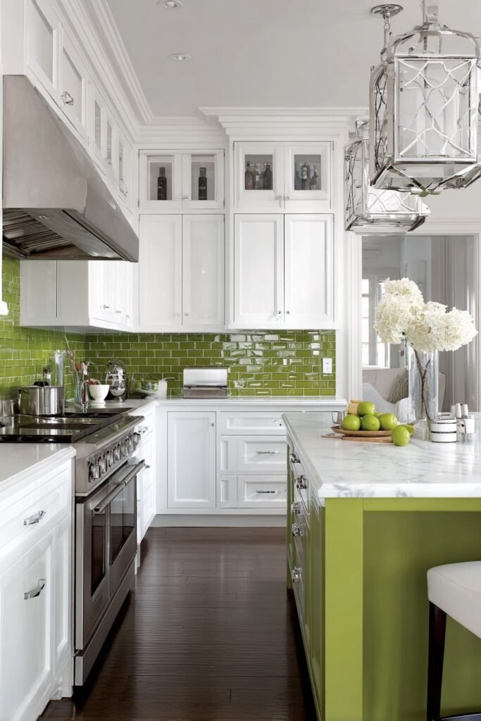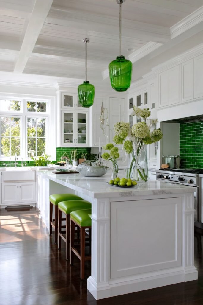 - Green-painted cabinets or island bases add a refreshing monochromatic twist while staying sophisticated.